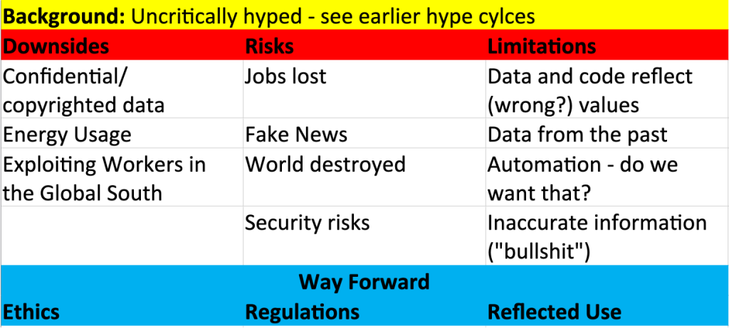 All the hype tends to ignore the risks, downsides and limitations of AI. I collected those in a discussion paper in 2024 (Allwein 2024). Here’s an overview. These range from exploiting workers in the global south, to the loss of jobs, the fact that the data is not neutral and of course „inaccurate information“, hallucinations or bullshit.