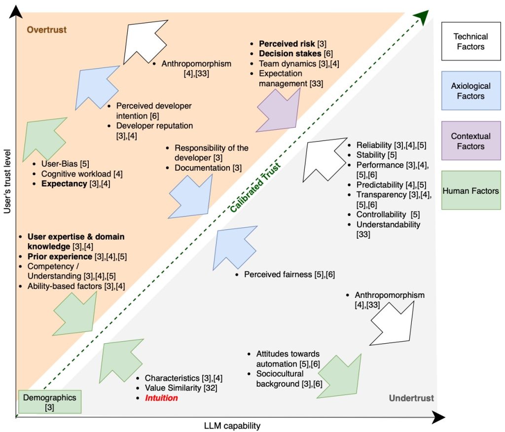 Next, we combined aspects of the calibrated trust model by Lee & See (2004), Afroogh et al.’s (2024) trust-related factors and Blöbaum’s (2022) recursive trust calibration process into a model describing the dynamic formation of trust in the context of hallucination-prone LLM usage. The figure below shows how calibrated trust is achieved when a user’s trust matches the capability of an LLM. It also shows the various factors either increasing or decreasing trust, along with references to the literature (see our paper for details).