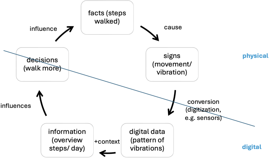 Let’s take a closer look at where the data comes from. Especially in predictive maintenance, it is clear that it is not the facts of the world being digitised, but certain signs in the physical world indicating them. Specifically, it’s not the mechanical condition of the railway track itself, but the measurable signs indicating this condition, e.g. slight variations in the movement or vibration patterns of the train. These are turned into digital data and, by contrasting this with previous data, a context is established that can yield information about the track’s condition (specifically whether it is damaged). This can inform decisions (e.g. adapting the maintenance intervals for the track), which again influence the initial facts (the track’s condition).